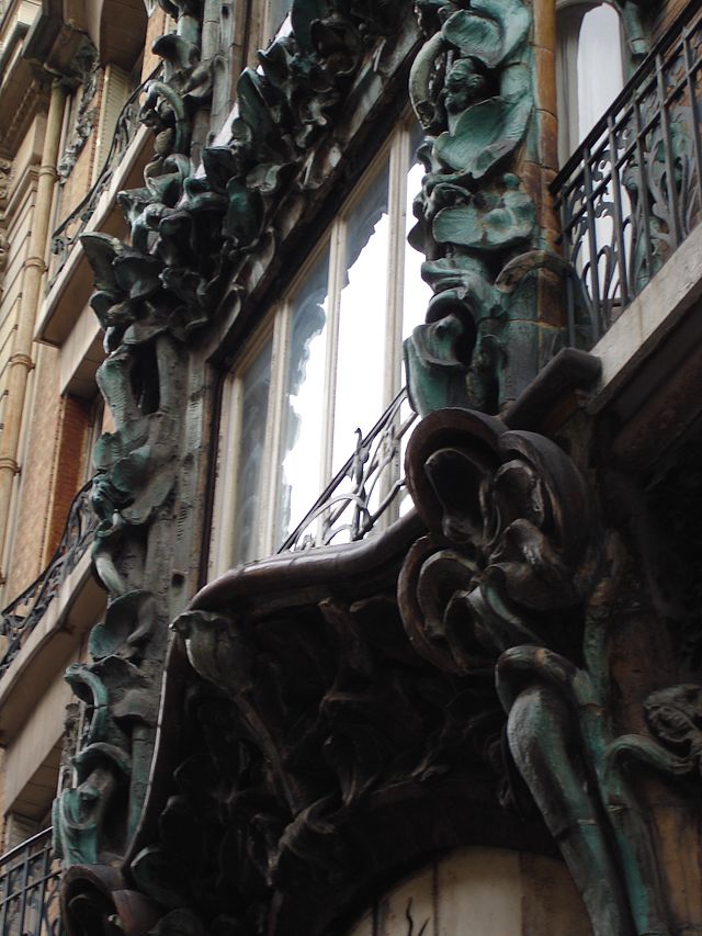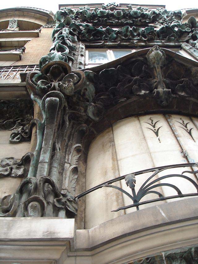Красивое здание Belle Epoque, построенное в стиле арт-нуво, наполненное цветами и изображениями животных, покрытых зеленой глазурованой керамикой фасад из камня и кирпича.